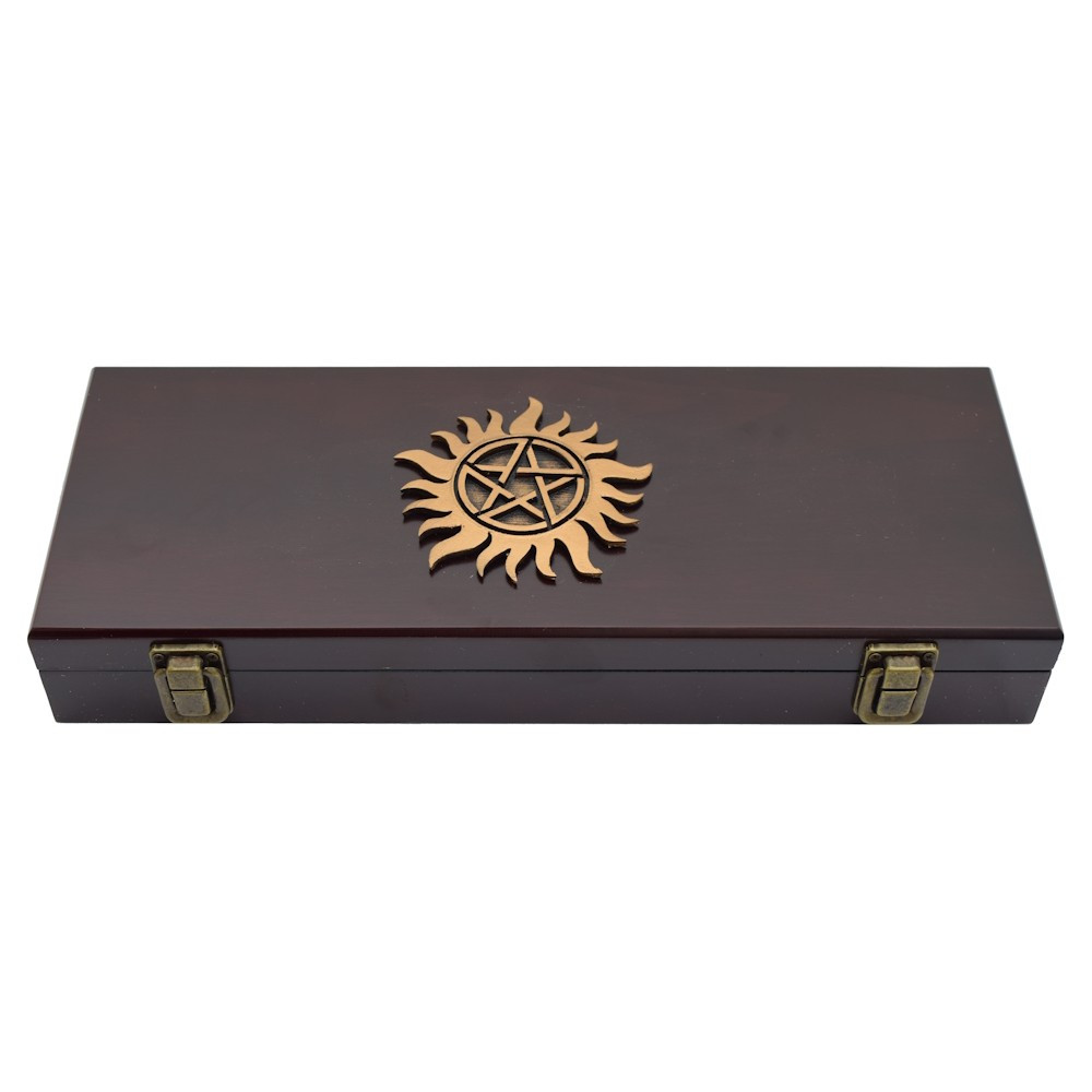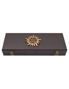 This replica evokes the mythical revolver associated with Dean, featuring finishes that seem to tell stories: the body showcases delicate engravings, and the handle with a wood-like appearance adds warmth and visual authenticity. The presentation in a dark wooden box with metallic hinges makes it an eye-catching object, ideal for collectors or anyone looking for a distinctive detail for their space.