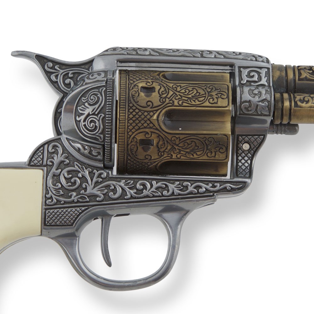 Its incredible level of detail and choice of materials convey a sense of durability and resilience that will accompany you for many years. Every carefully crafted engraving sparks curiosity and respect in those who see it, turning it into an authentic magnet for admiring gazes. The imitation ivory on the grips reflects a touch of elegance that elevates the presence of this piece, which is not just a collectible object, but a reflection of your attitude and personality. Although it is non-functional, this replica offers the satisfaction of owning a fragment of Western history, transmitting that aura of power and presence that only a piece like this can project. With a size of 27 cm, its presence is commanding yet adaptable to any space, leaving a lasting impression on those who observe it.