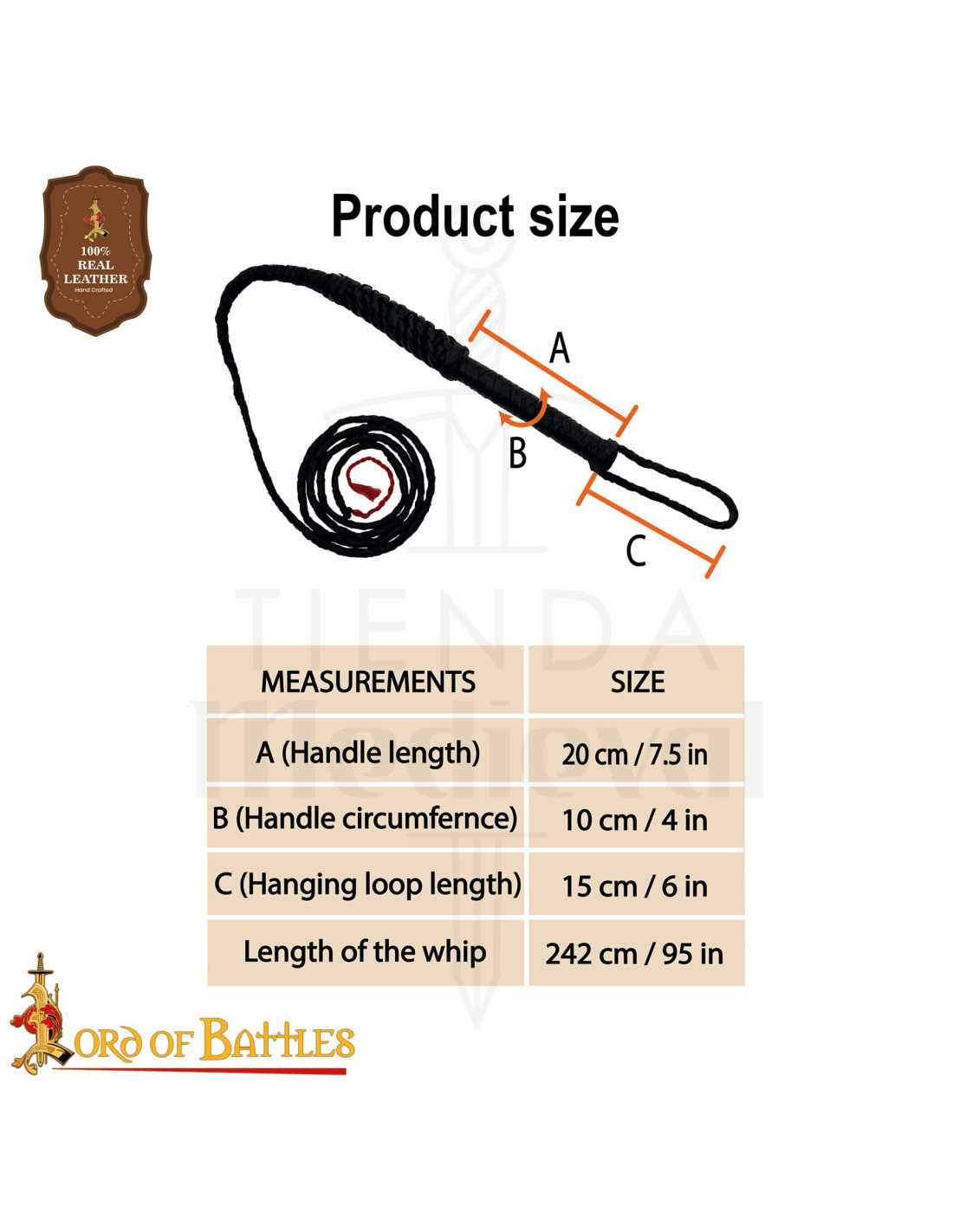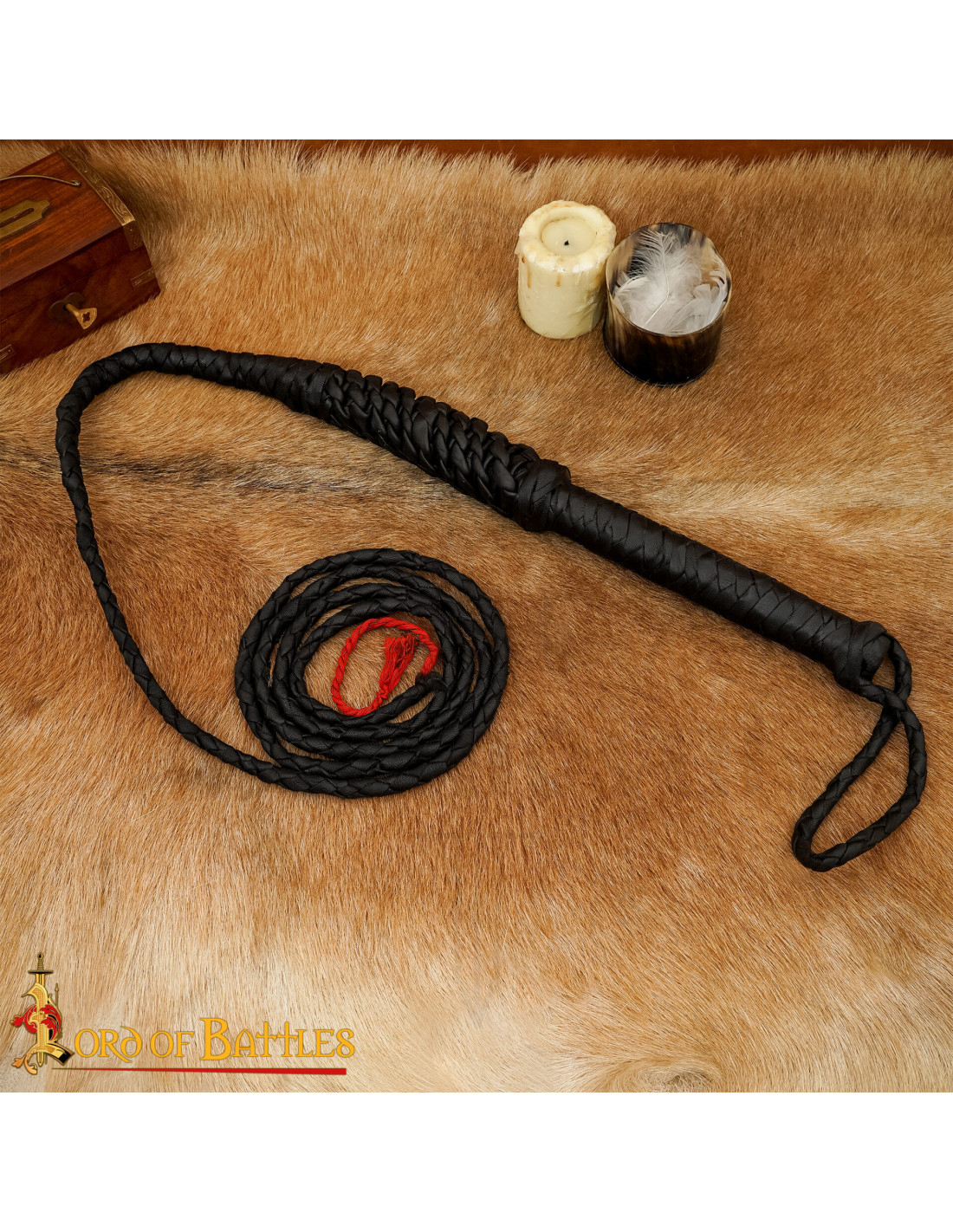 If your goal is to purchase a hand-braided black leather medieval whip (242 cm.), you are choosing a piece that functions both as a stage element and a costume accessory for historical or fantasy settings. Its design perfectly fits characters from medieval-themed worlds or fantasy realms, adding authority and realism to your portrayal.