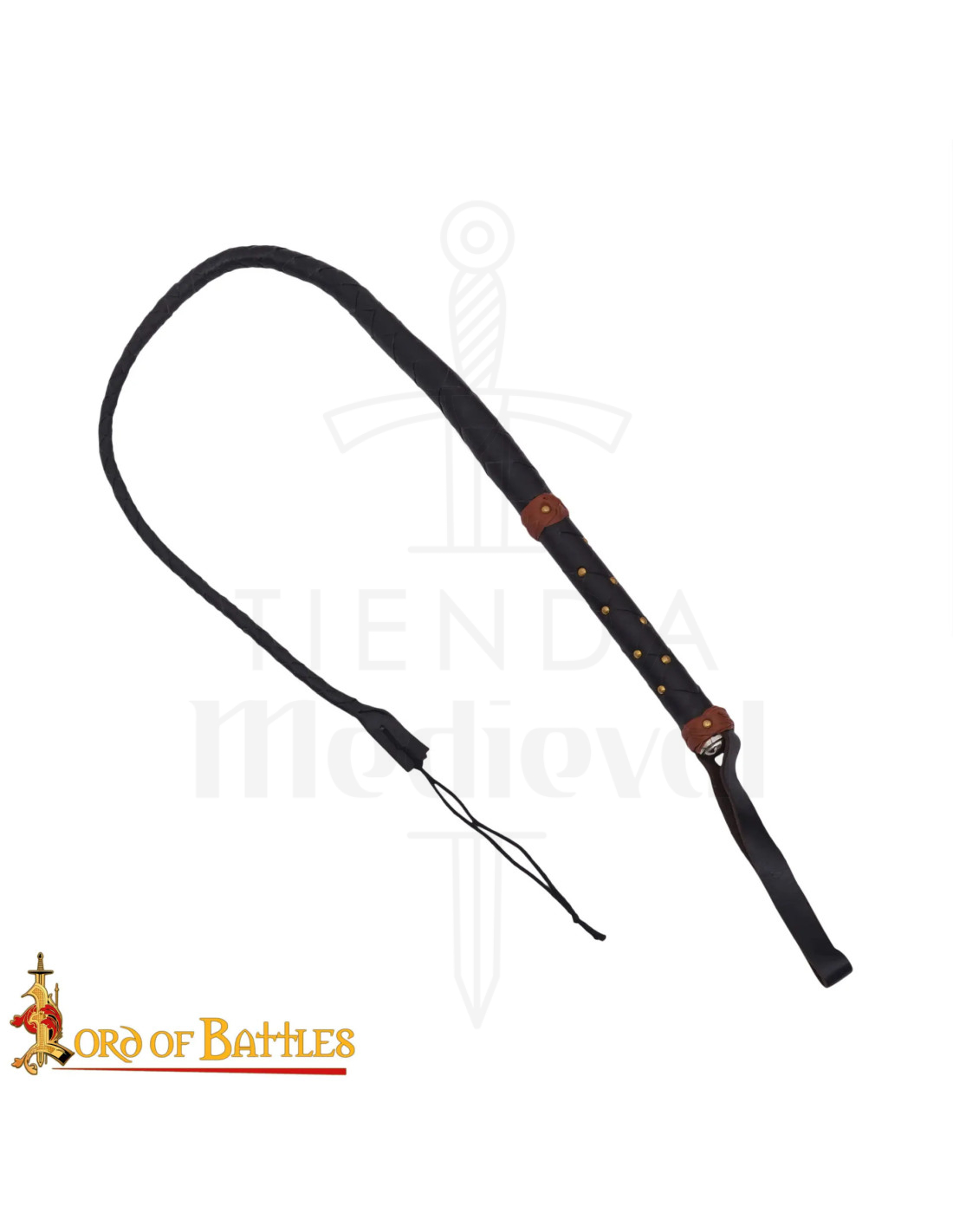 Ideal for theatrical productions, historical reenactments, and costumes with aesthetic demands, its construction of genuine leather and the detail of the rivets convey a rugged and realistic appearance, designed to stand out under lights and in showcases. Each piece may exhibit natural variations in tone and texture, adding unique character to each whip.